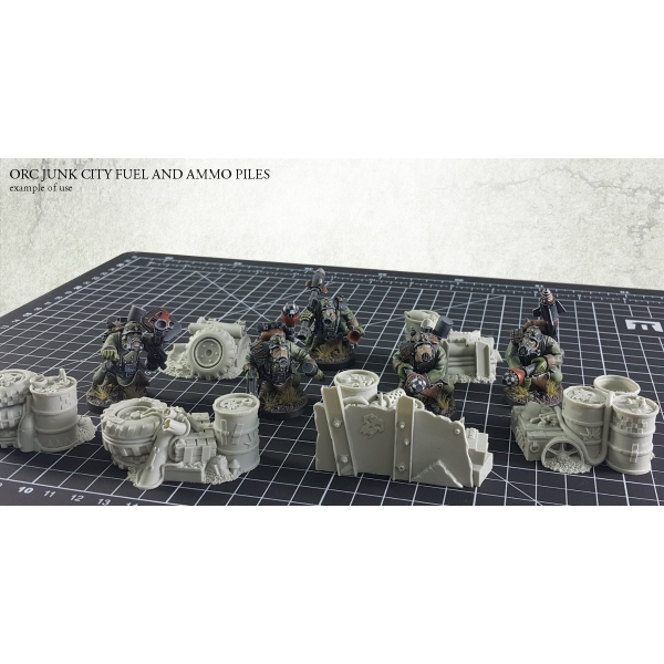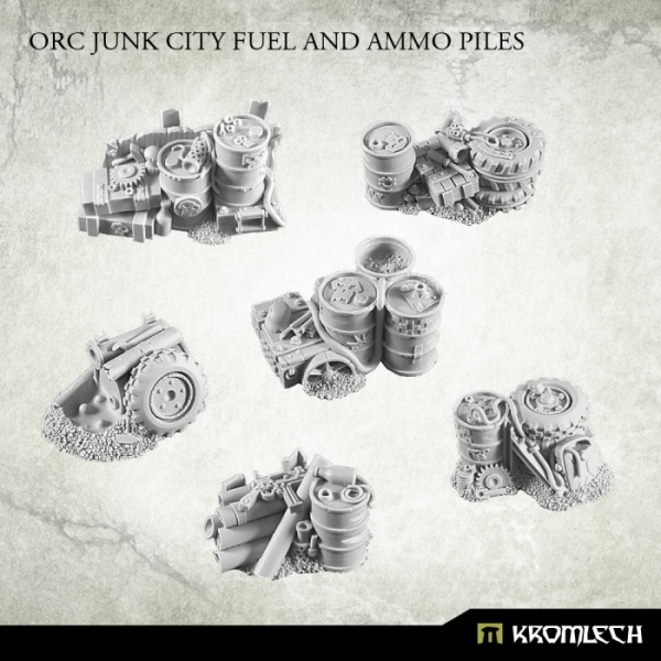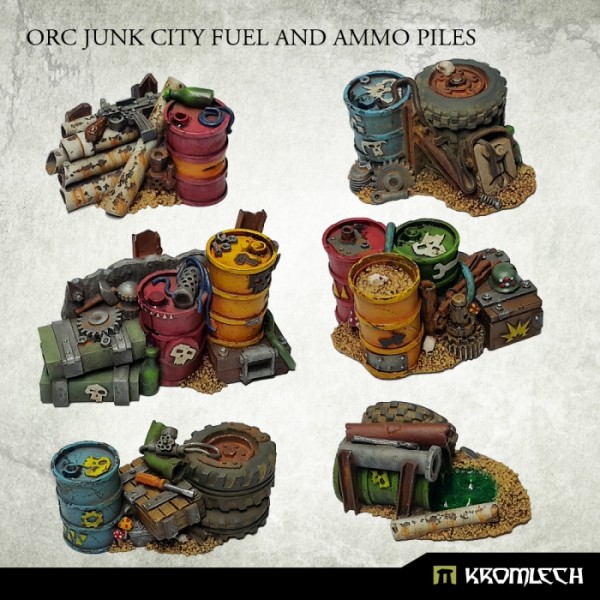 This set contains six resin Orc Junk City Fuel and Ammo Piles scatter terrains. Designed to fit futuristic 28mm heroic scale terrain and models.